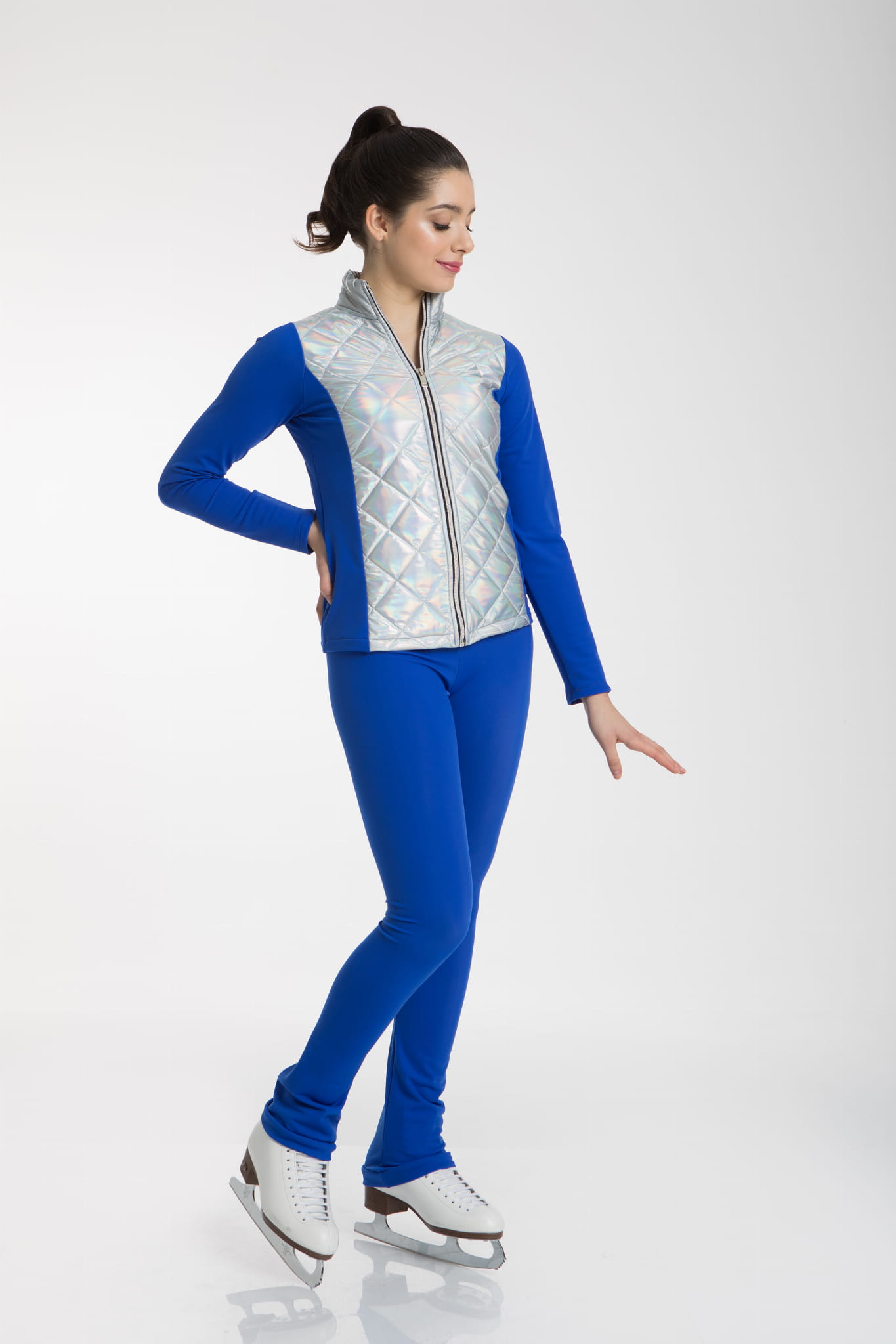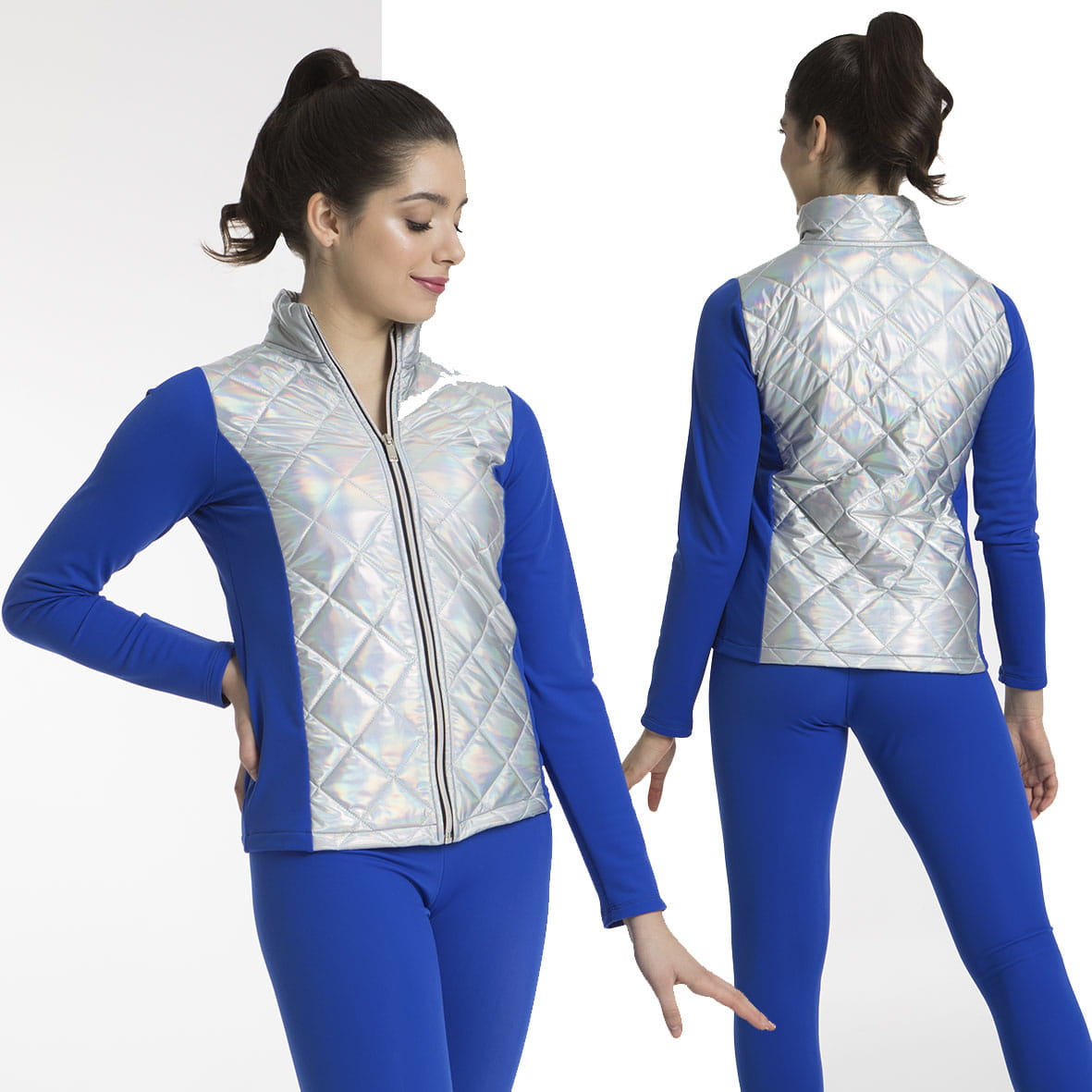 Bluza łyżwiarska pikowana. Idealny ocieplacz dla łyżwiarek w czasie rozgrzewki i między kolejnymi treningami. Bluza zasuwana jest na zamek błyskawiczny. Plecy i przód wykonane z połyskującej w odcieniach metalicznych i srebra, pikowanej i ciepłej tkaniny. Boki wykonane z ciepłej i rozciągliwej tkaniny z delikatnym misiem od środka.