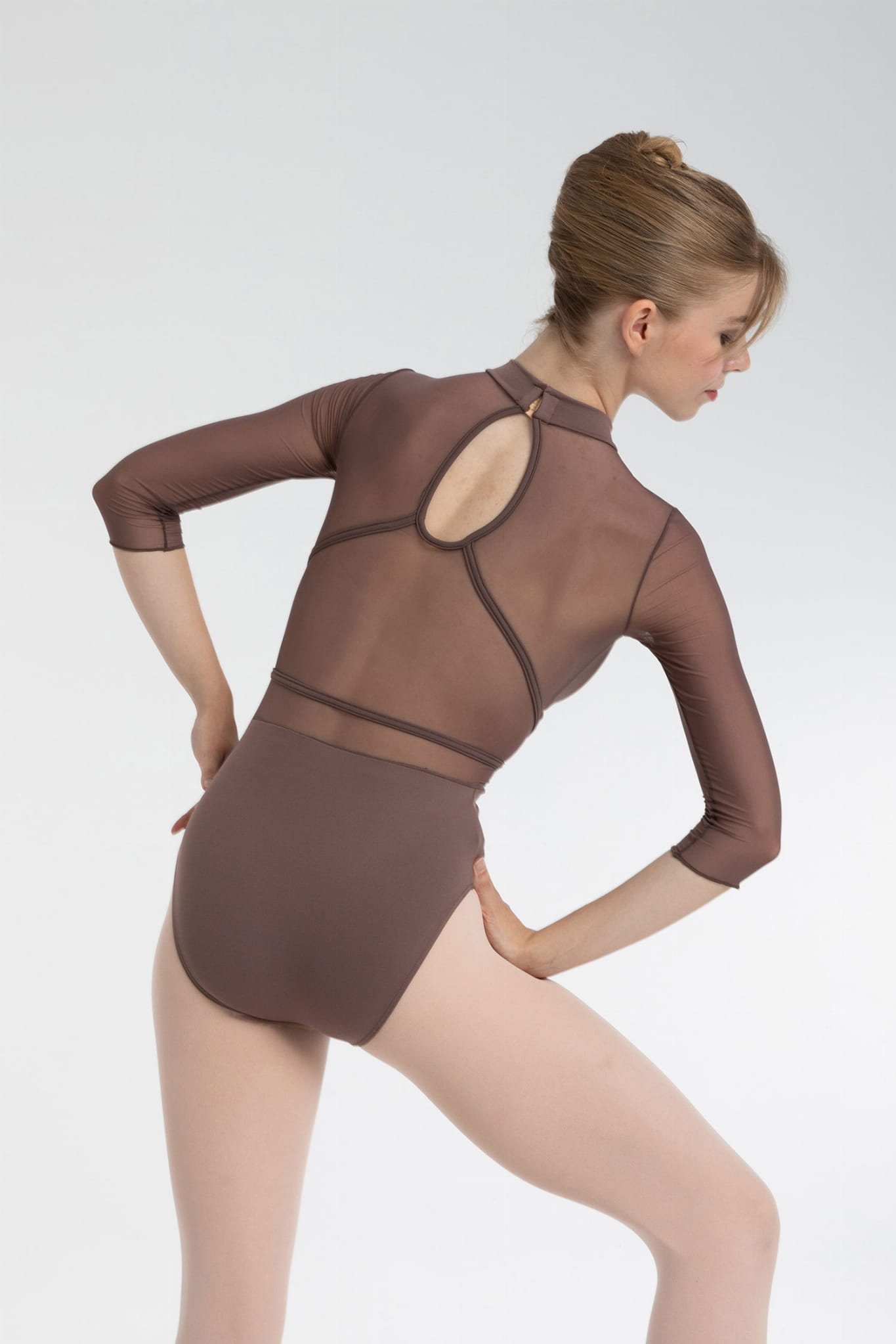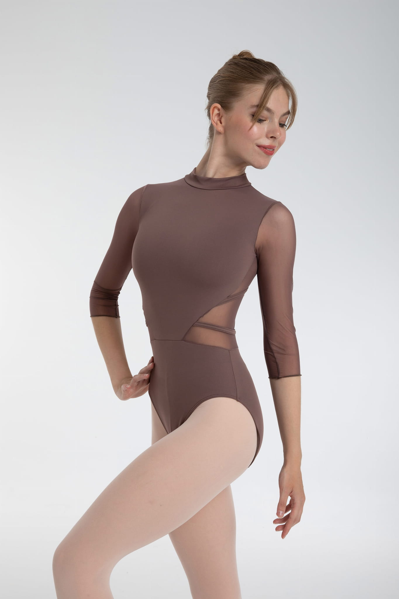 Elegancki kostium baletowy z rękawem 3/4 i golfem. Wykonany z przyjemnej i miłej w dotyku tkaniny meryl. Tył oraz rękawy wykończone elastyczną siateczką. Zapinany na haftkę w tyle. Pełna podszewka z przodu.