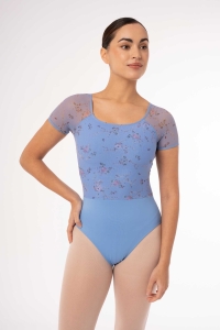 Body baletowe Felicity z krótkim rękawem. Kostium baletowy ozdobiony pasującym kolorystycznie elastycznym tiulem z nadrukiem kwiatowym przy dekolcie, plecach i rękawach. Przód w całości podszyty miękką podszewką bieliźnianą.