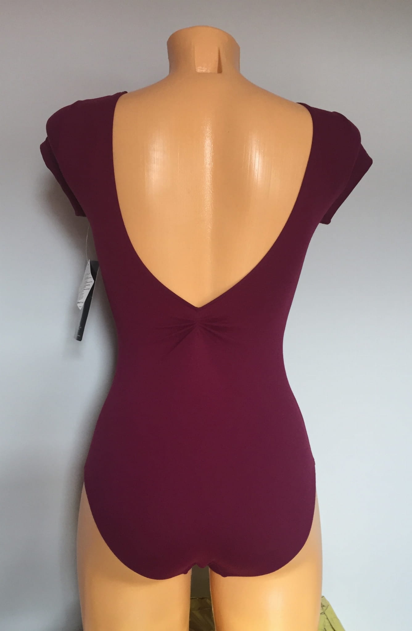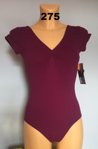 Body z krótkim rękawkiem i dekoltem w szpic wykończonym delikatnym marszczeniem. Na plecach głęboki dekolt zakończony delikatnym marszczeniem. Bardzo eleganckie i wygodne, pozwalające na dużą swobodę ruchów. Pięknie eksponuje plecy tancerki, a dekolt optycznie wydłuża szyję. Podszewka na biuście. Model lubiany przez profesjonalistów. Wykonane z tkaniny Supplex idealnie przylegającej do ciała tancerki.