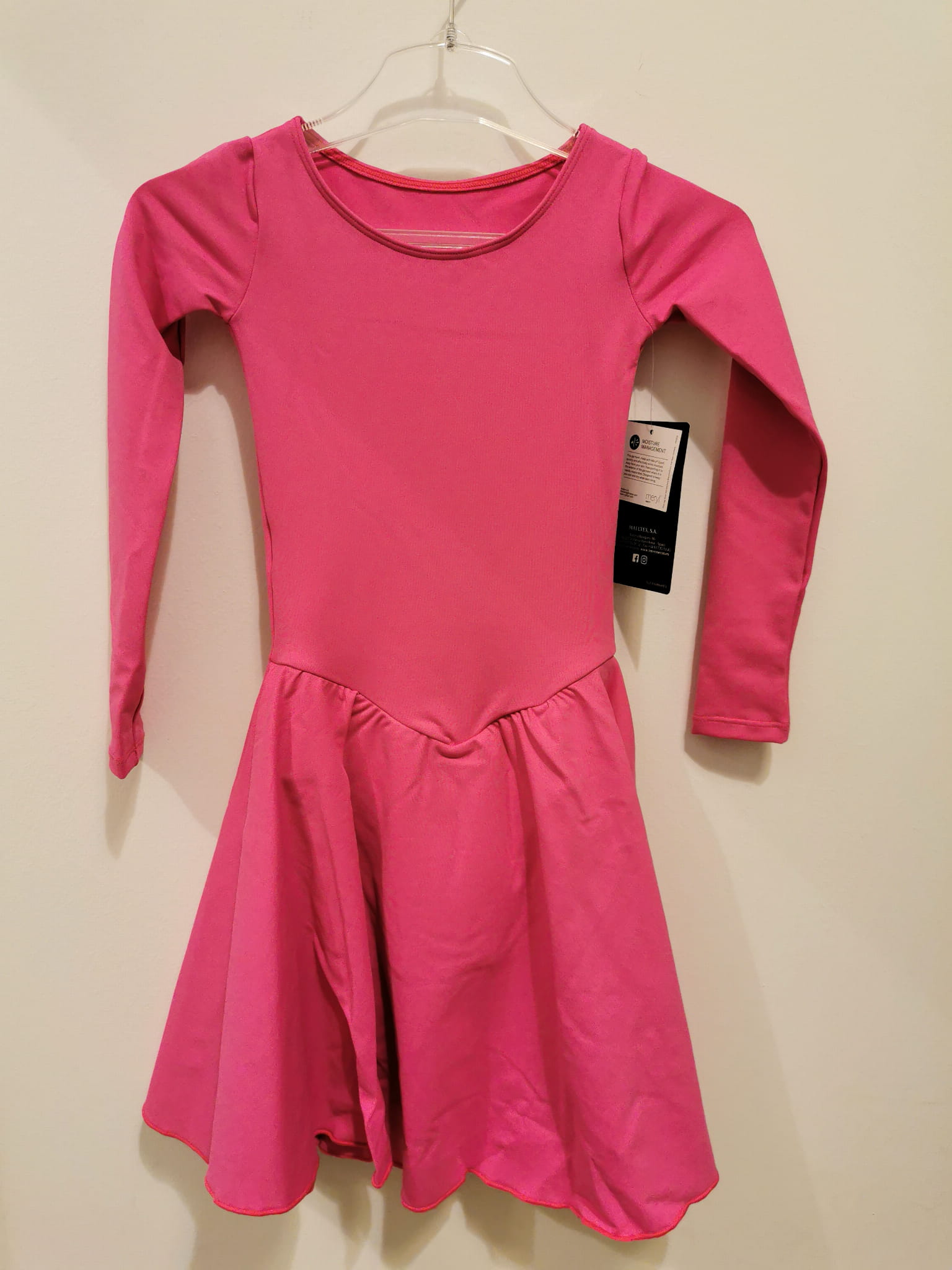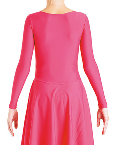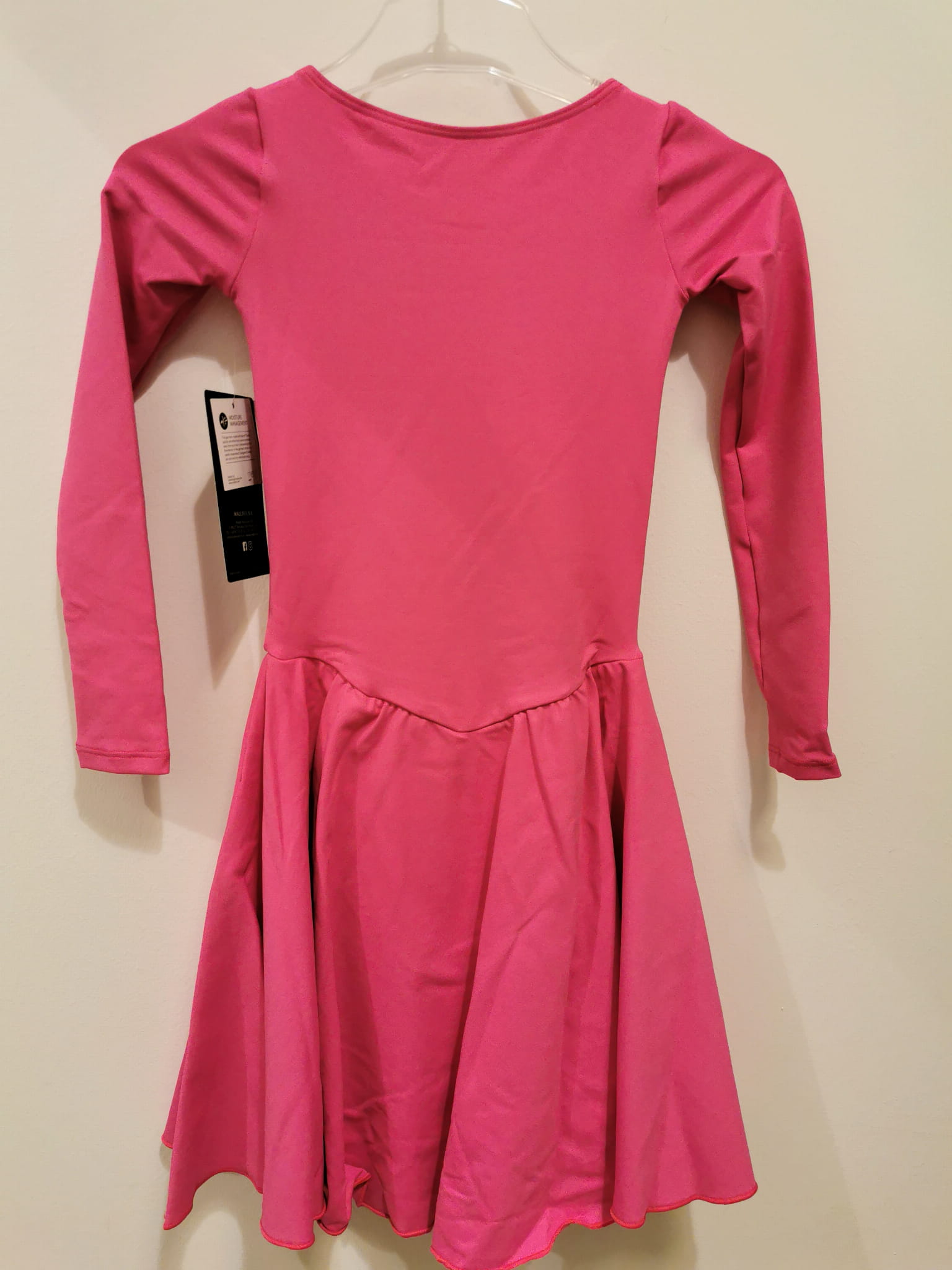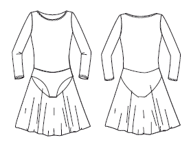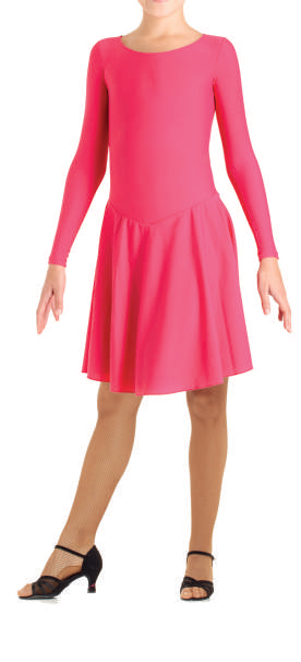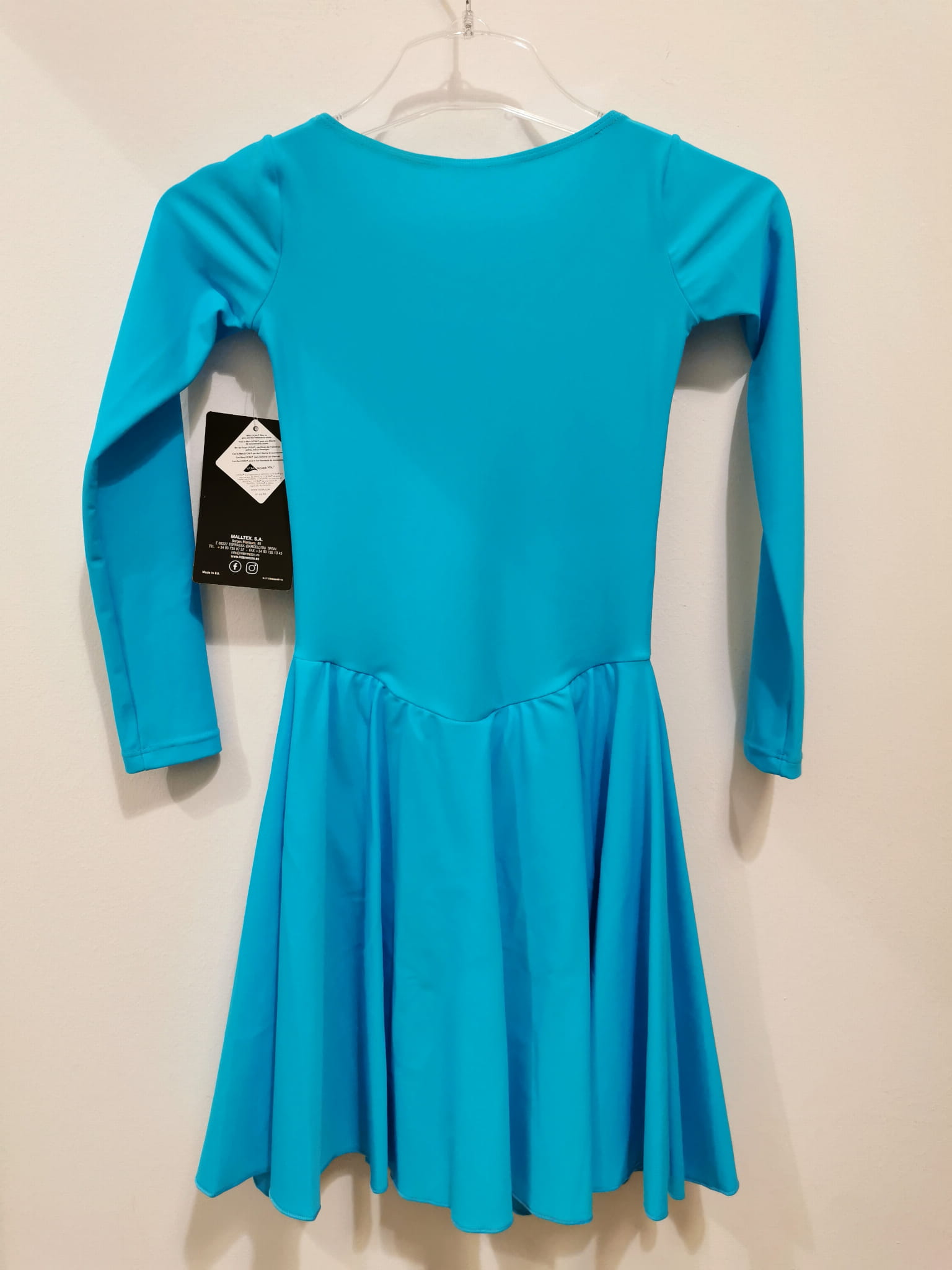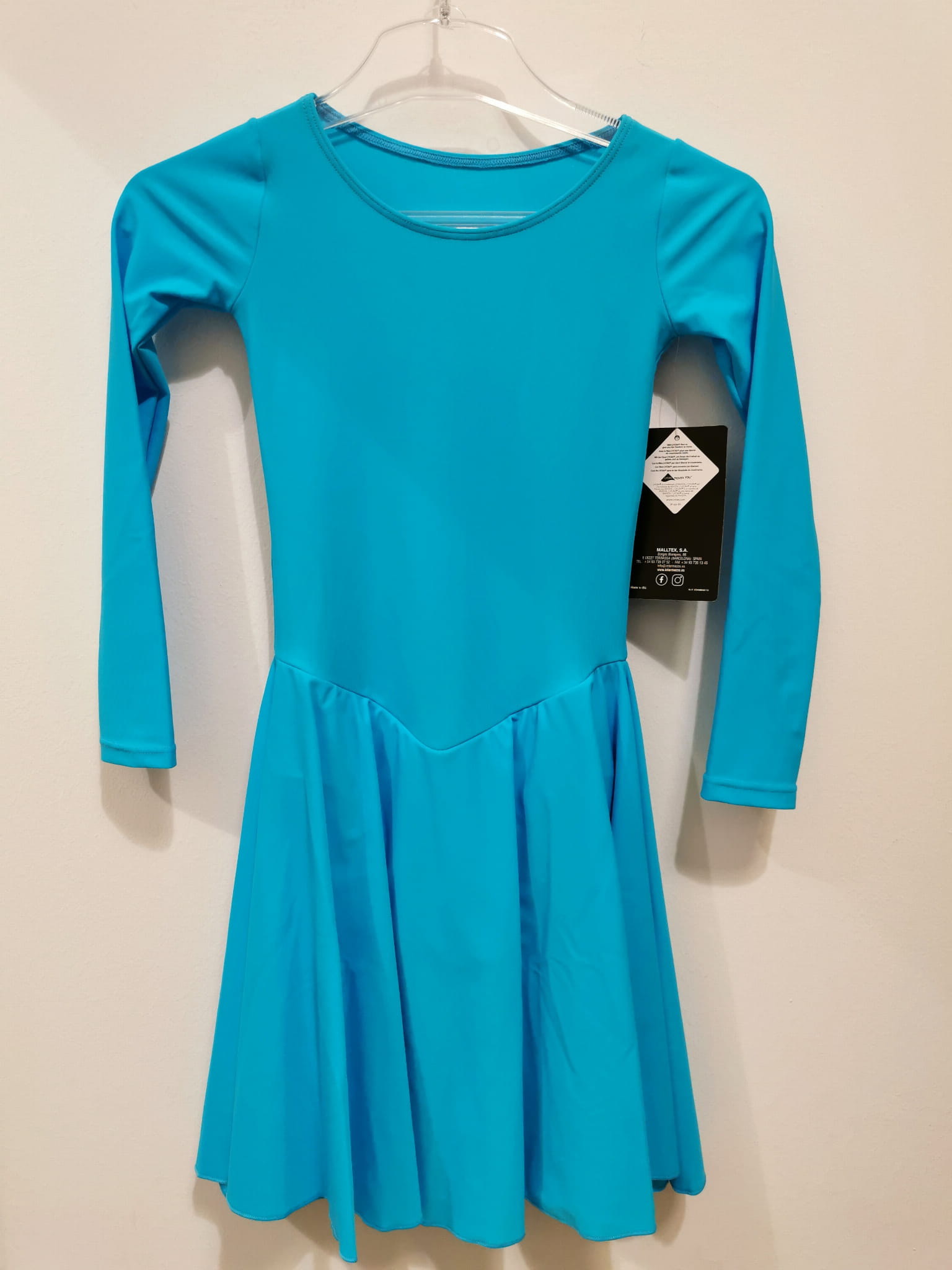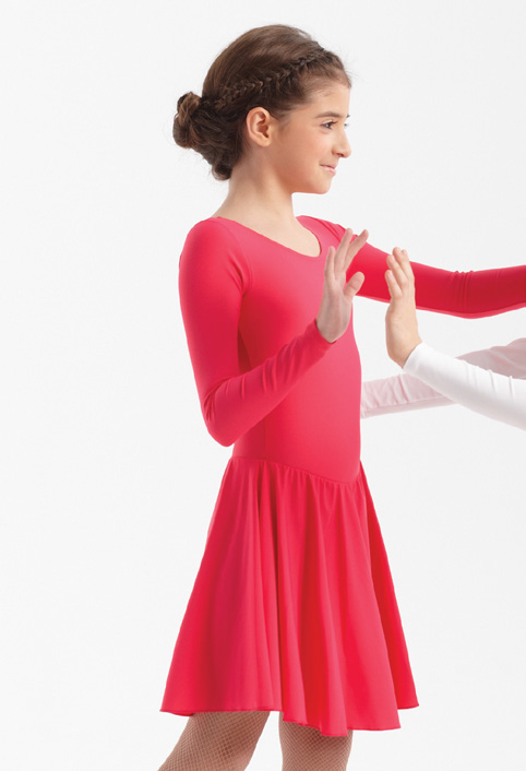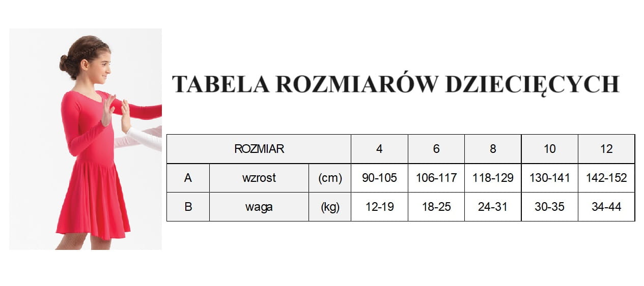 Dziewczęca sukienka taneczna z długim rękawem. Dół mocno rozkloszowany. W spodniej części wszyte majtki. Bardzo wygodna i komfortowa, dająca dużą swobodę ruchu. Wykonana z tkaniny miłej i przyjemnej w dotyku.