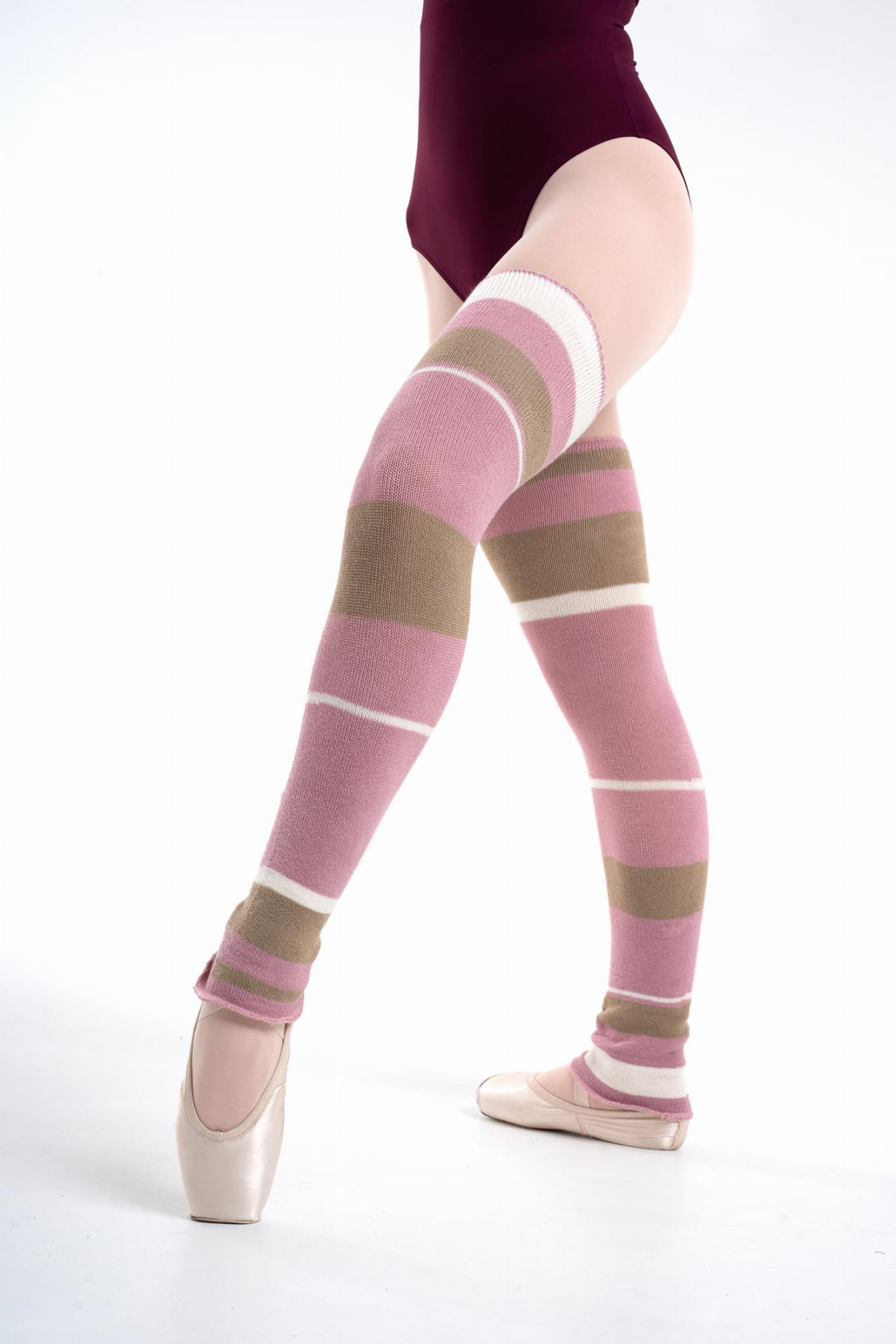 Długie getry w asymetryczne paski. Utrzymują ciepłotę nóg zarówno w czasie rozgrzewki, jak i w przerwach między zajęciami. Wykonane z naturalnych włókien bambusa. Rozmiar M długość ok. 65 cm.