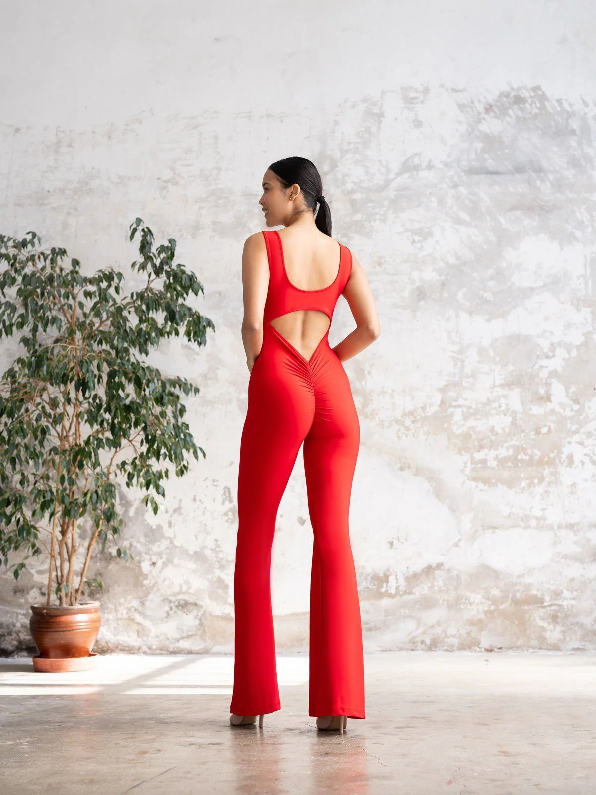 Piękny czerwony kombinezon damski z nogawkami typu "dzwony" z częściowo odkrytymi plecami.