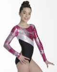 Bardzo wygodny i efektowny kostium gimnastyczny. Wykonany jest z kontrastującej kolorystycznie tkaniny ze srebrzystym połyskiem w połączeniu z klasyczną czernią. W zestawie gumka do włosów.