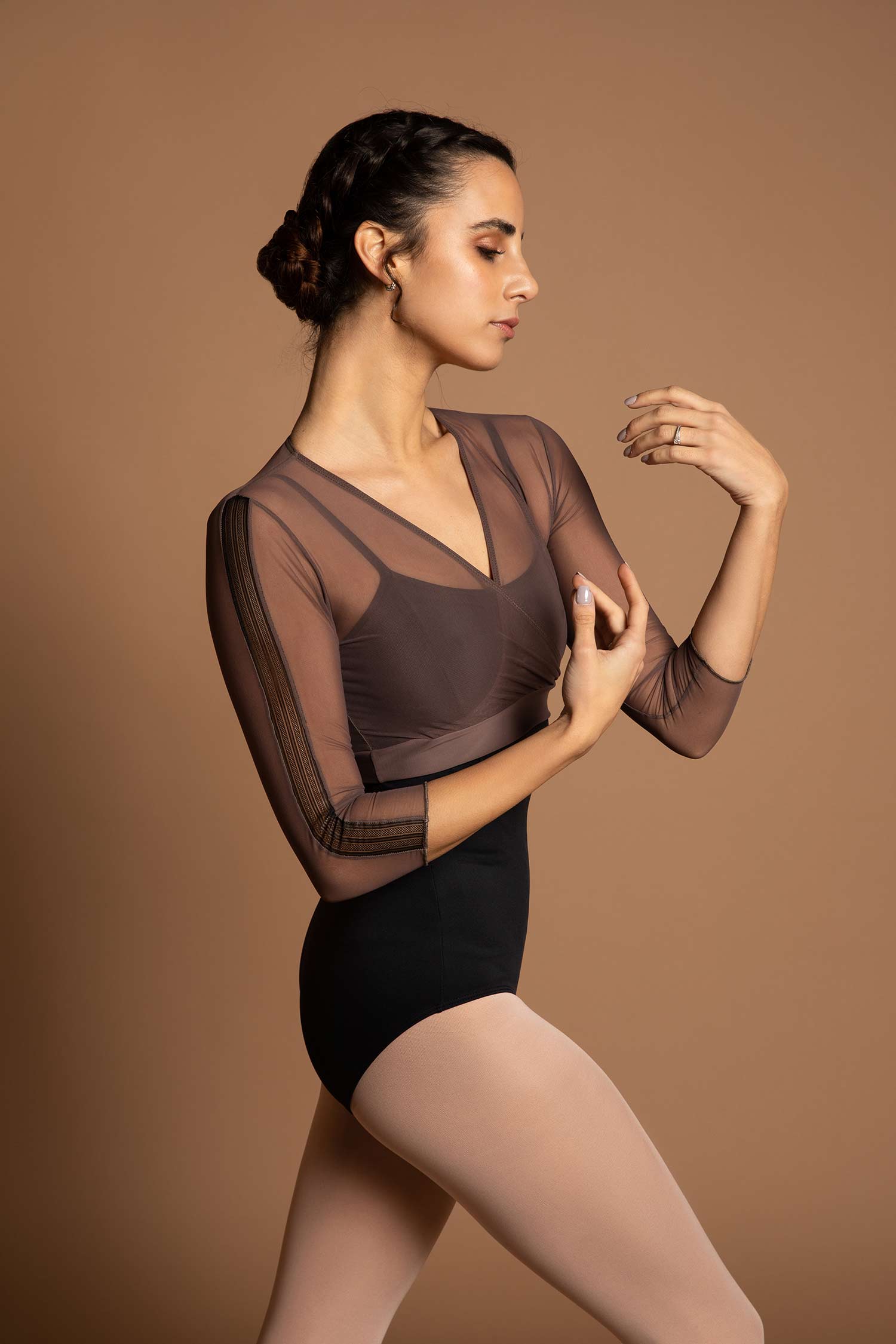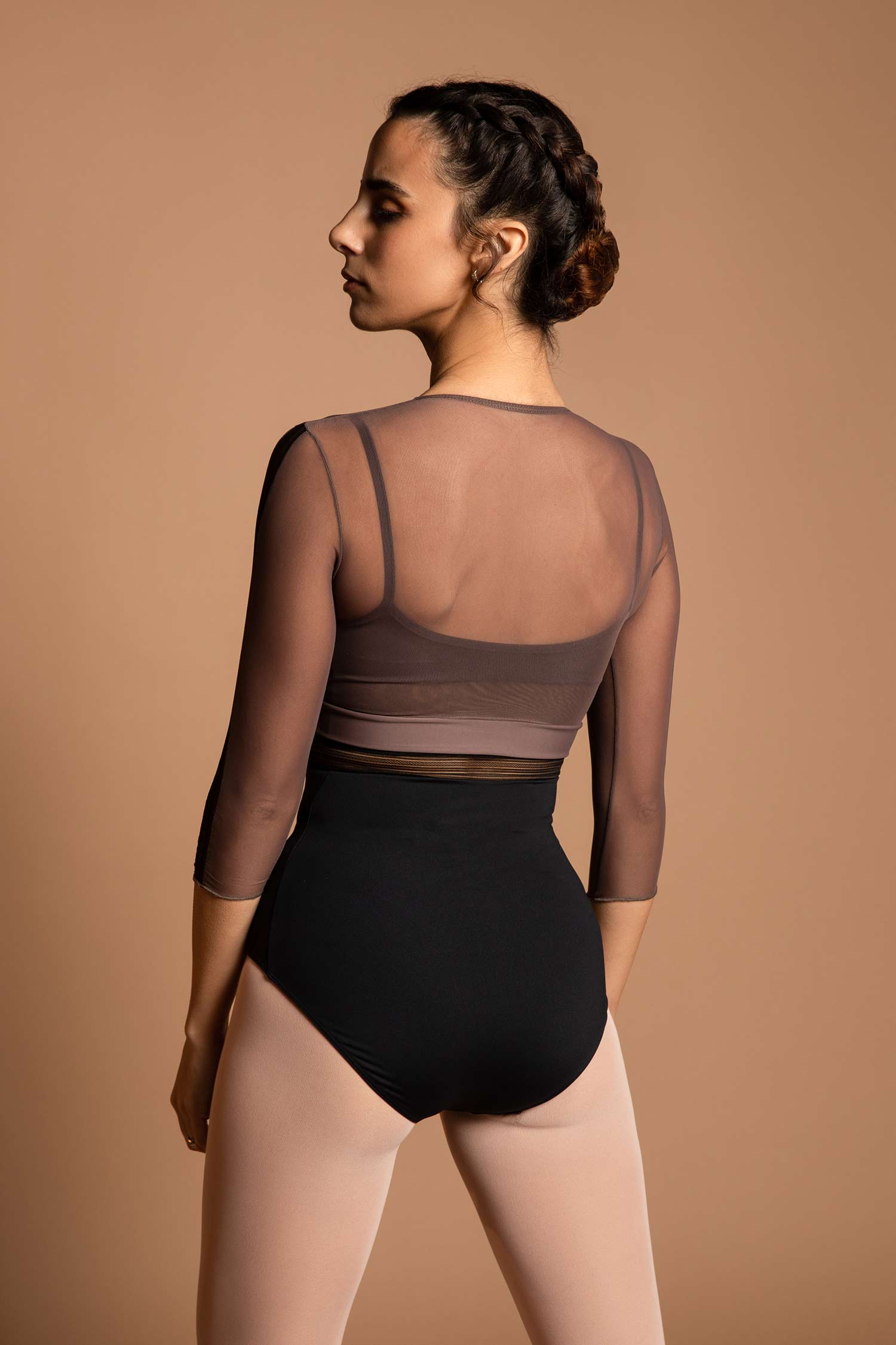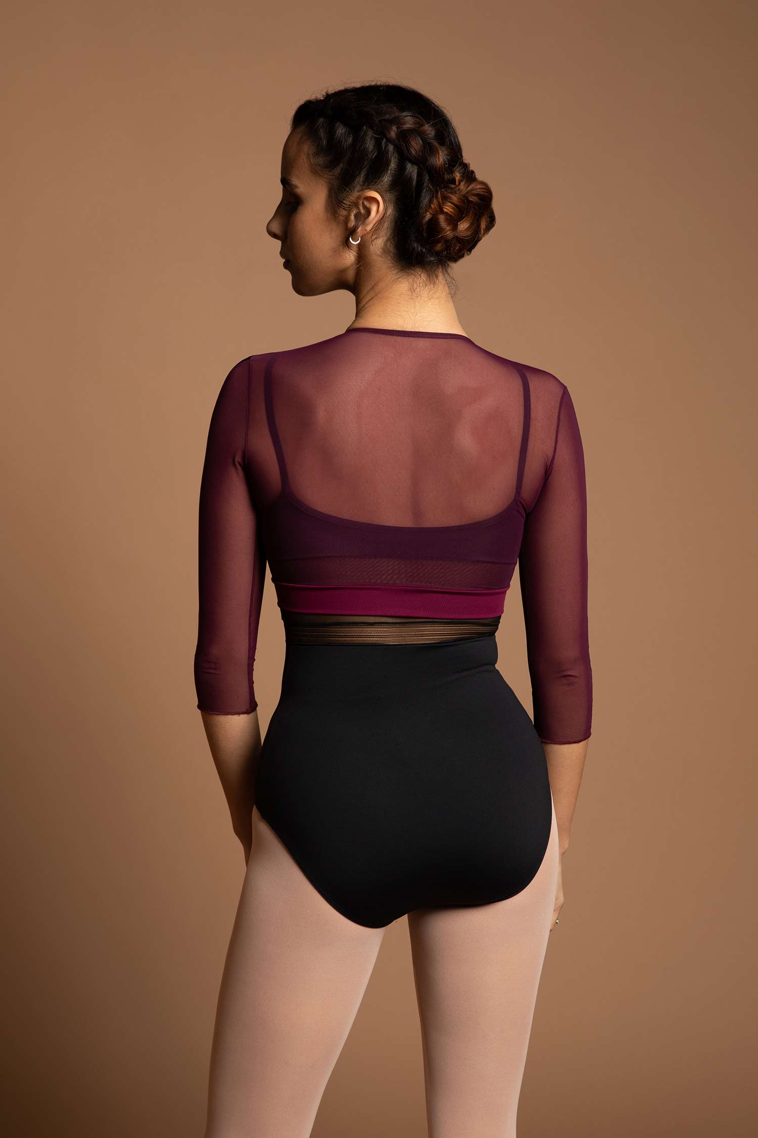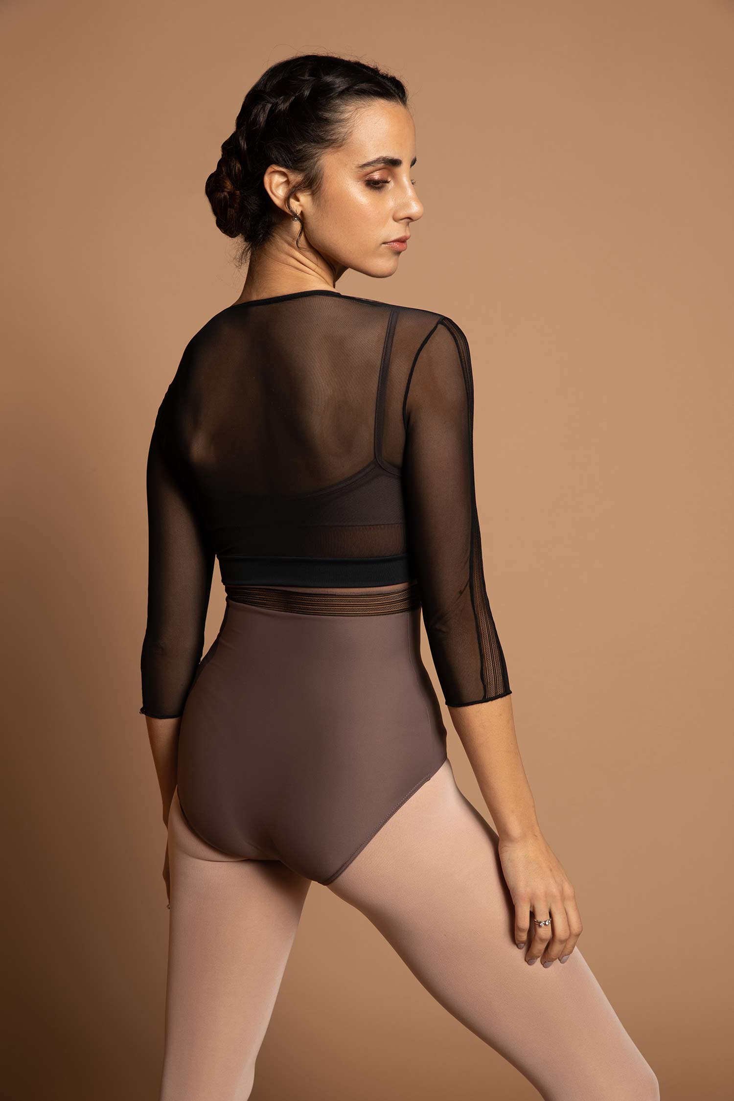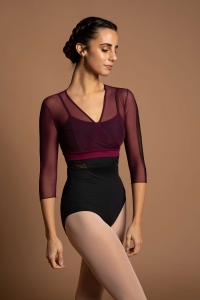 Krótka koszulka z siateczki. Rękawy 3/4 z elastyczną i ozdobną tasiemką. Można ją nosić z body do tańca.