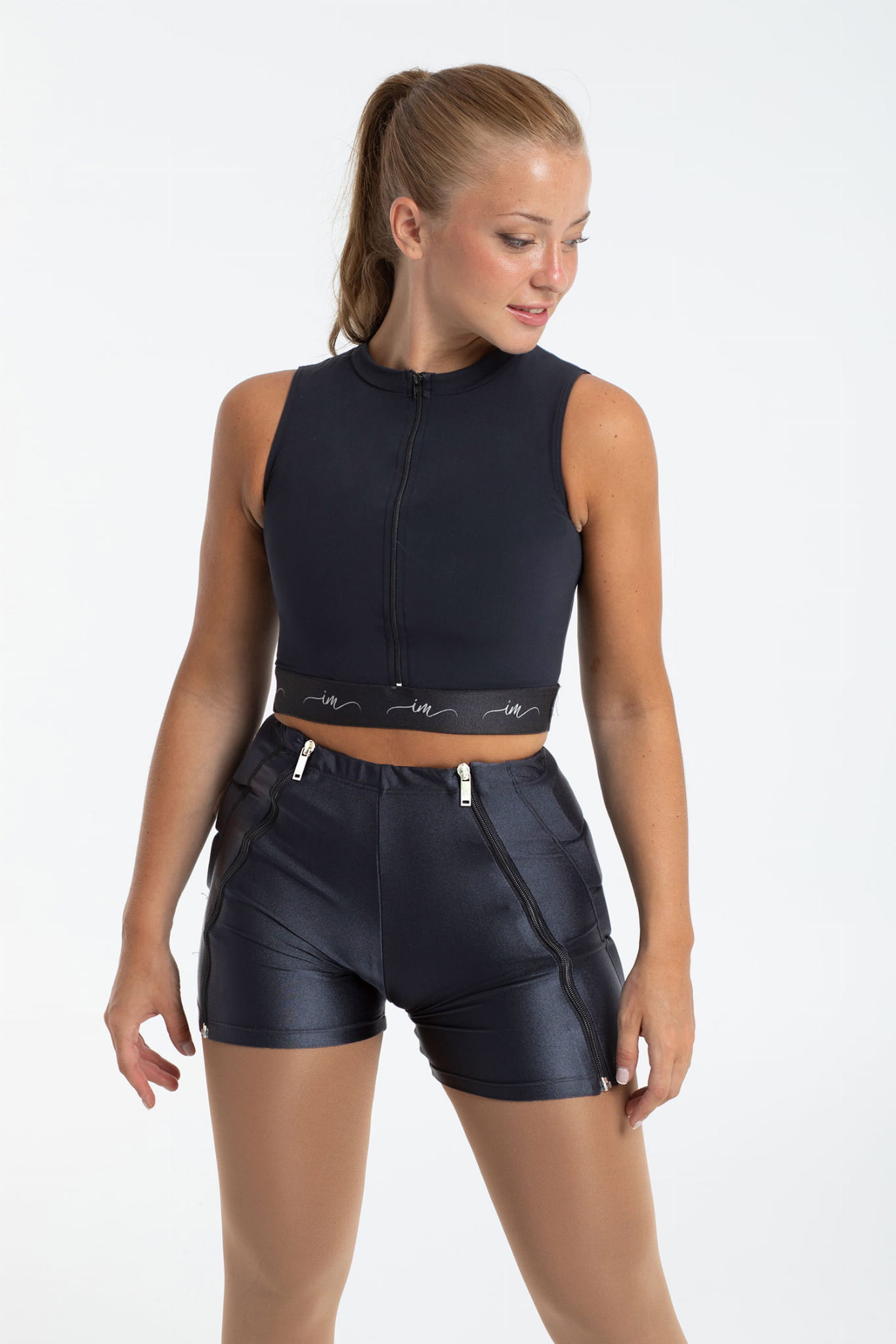 Spodenki ochraniacze do jazdy na łyżwach. Zapinane z przodu na zamek błyskawiczny. Można je założyć bez konieczności zdejmowania łyżew.