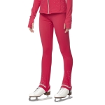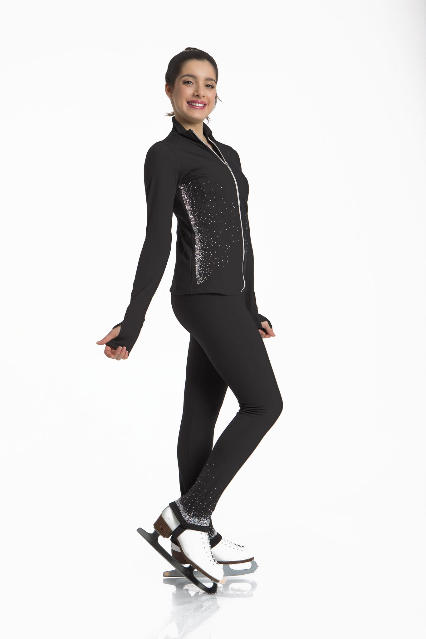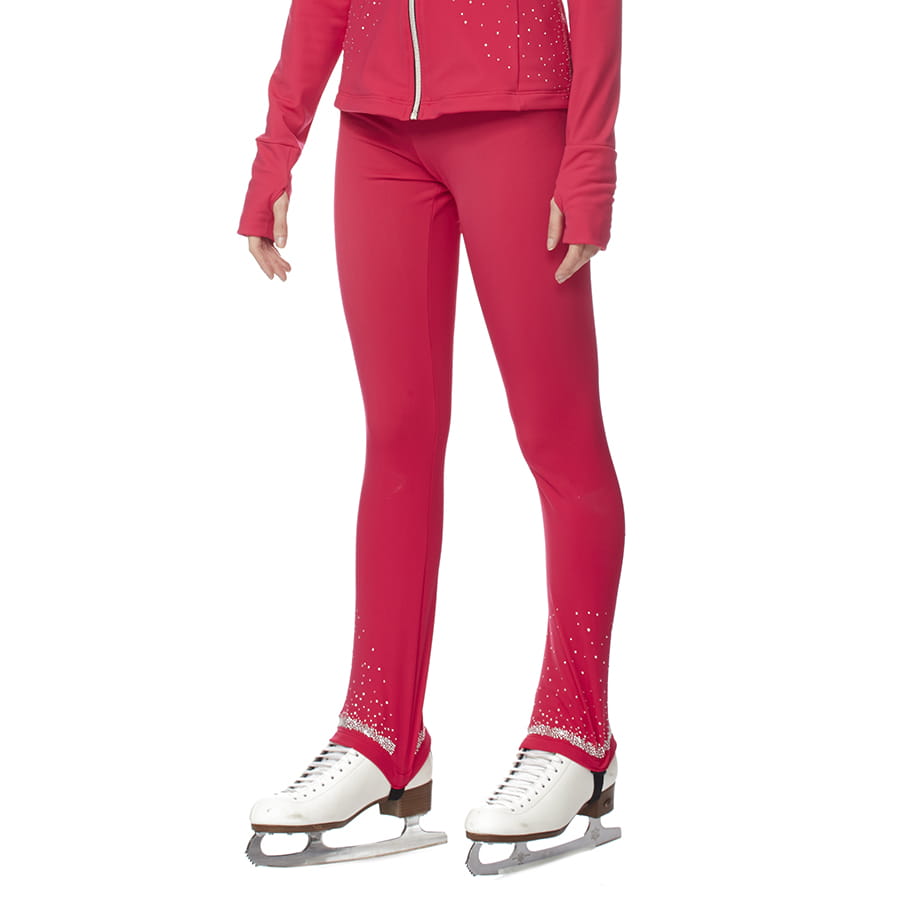 Ocieplane spodnie dresowe. Idealny ocieplacz dla łyżwiarek w czasie rozgrzewki i między kolejnymi treningami. Wygodne spodnie dresowe z nogawkami podszytymi gumą zabezpieczającą przed zsunięciem się z buta łyżwiarskiego. Dół nogawek ozdobiony kryształkami.
