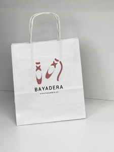 Torba papierowa z logo naszego sklepu BAYADERA, wykonana z grubszego papieru 90 g/m² i ze skręcanymi uchwytami, łączy kompaktowy rozmiar z klasą premium.