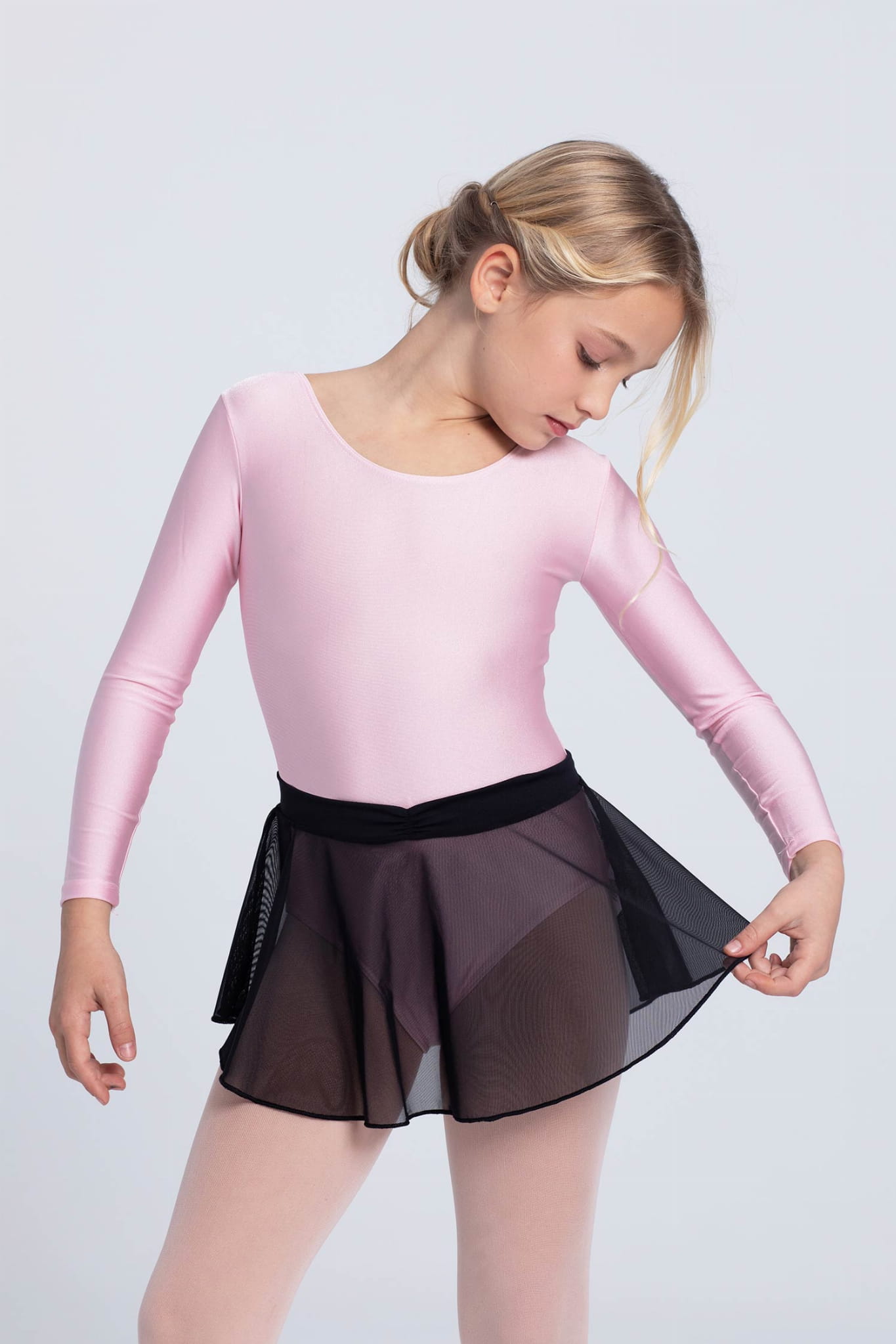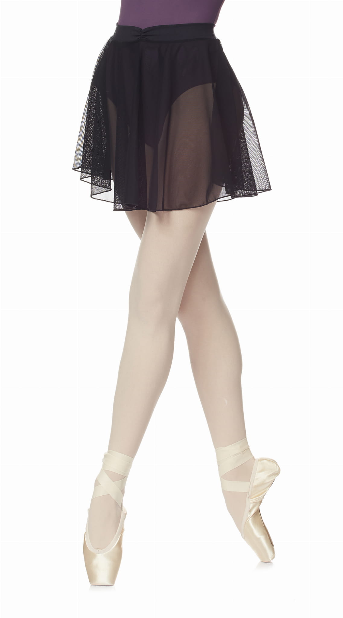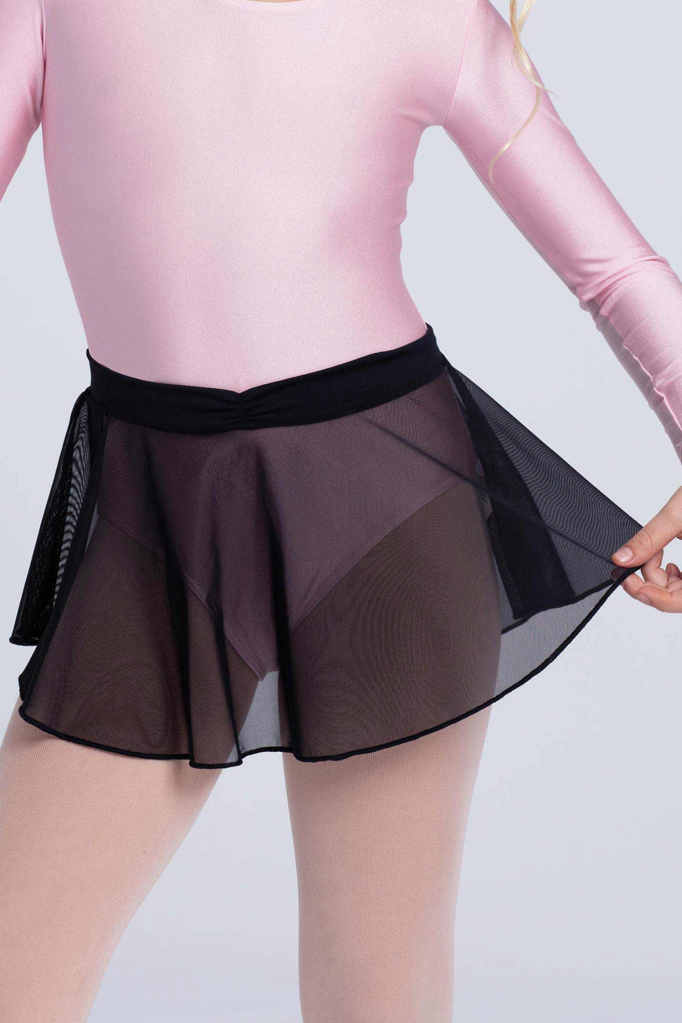 Tunika z elastycznej siateczki. Pas jest wykonany z elastycznej tkaniny Meryl z lekkim marszczeniem z przodu. Nie posiada wiązania co stanowi duży komfort podczas zakładania i zdejmowania przy jednoczesnym każdorazowym równomiernym ułożeniu na sylwetce tancerki.