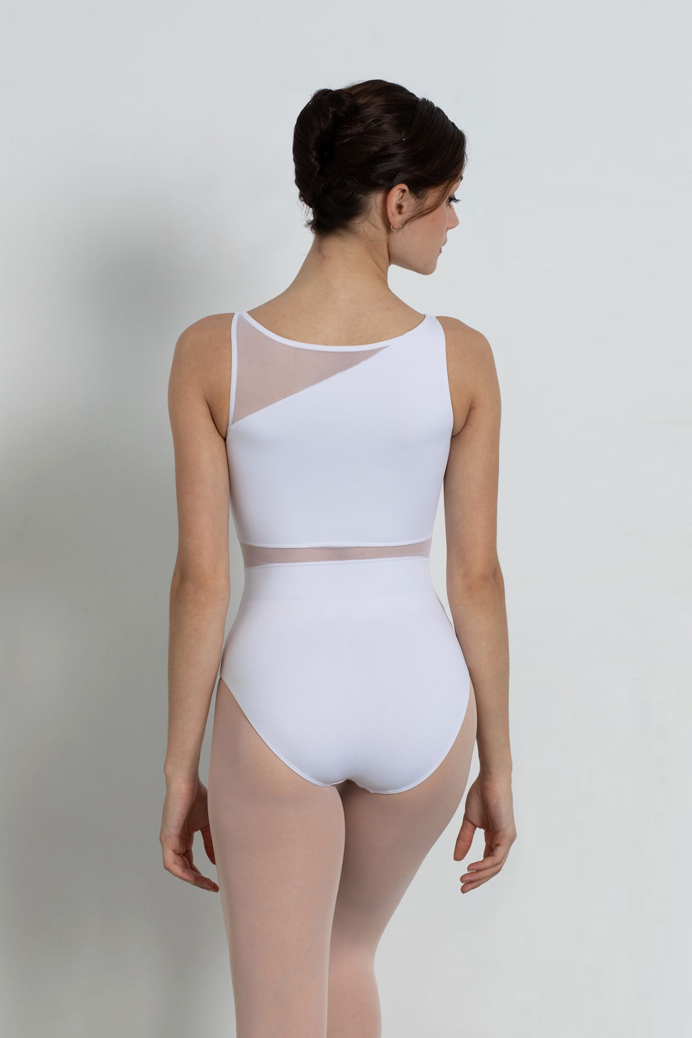 Body baletowe CLEMENTINE ozdobione elastyczną siateczką. Efektowne, asymetryczne wstawki z elastycznej siateczki w kolorze identycznym jak cały kostium dodają nowoczesnego charakteru. Kostium na nieco szerszych ramiączkach. Pełna podszewka z przodu.