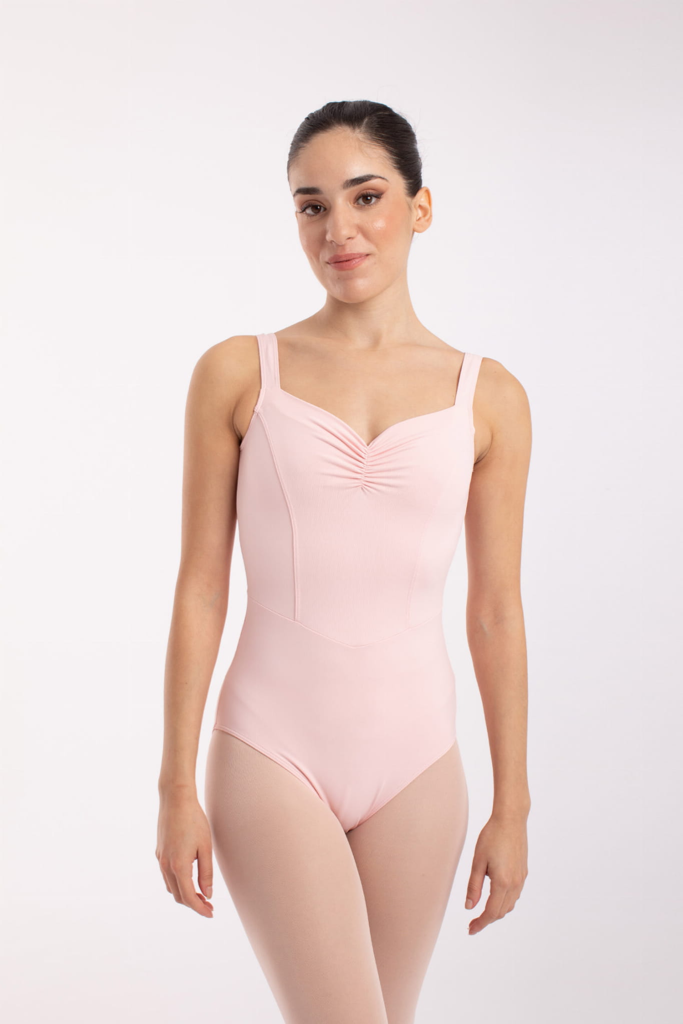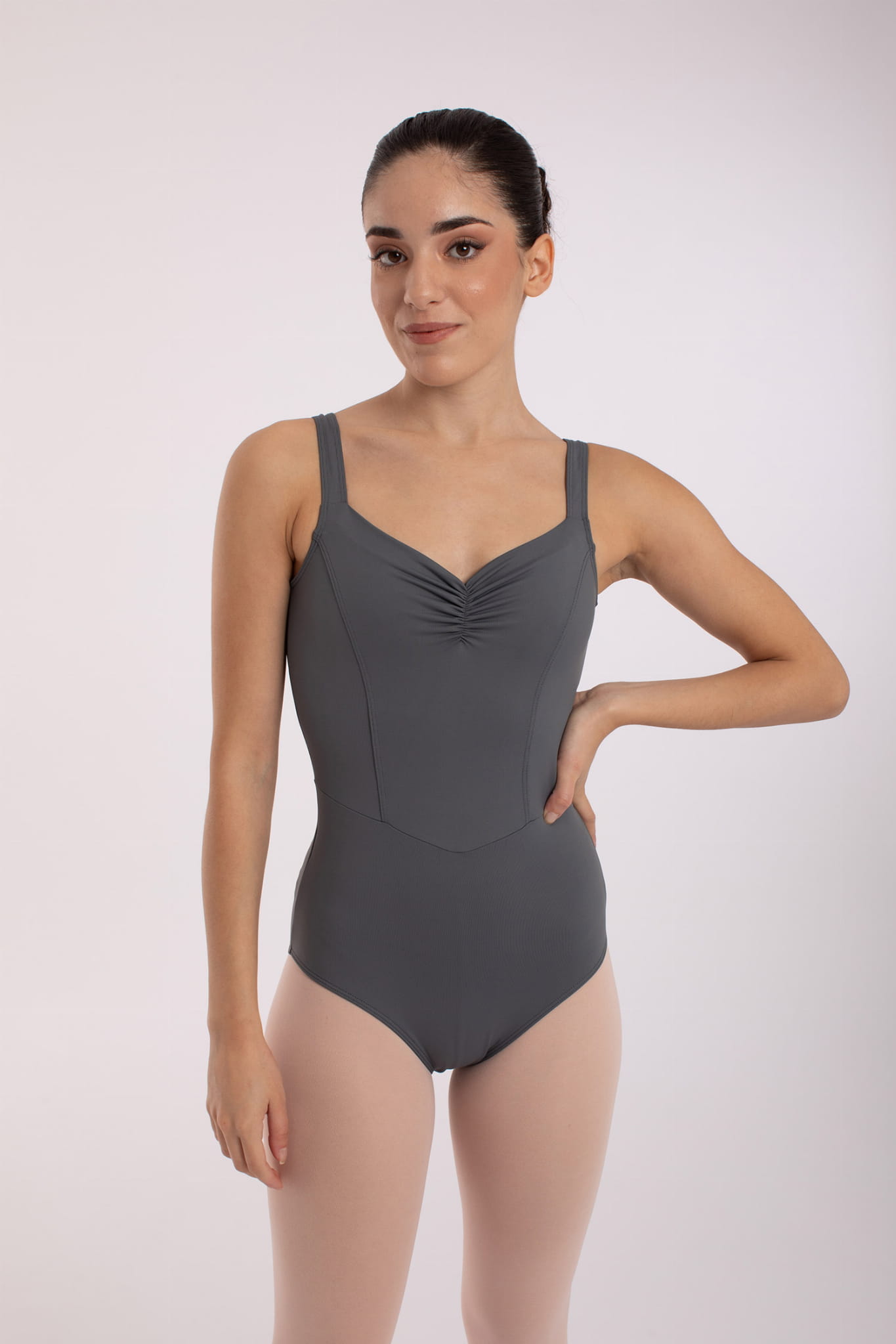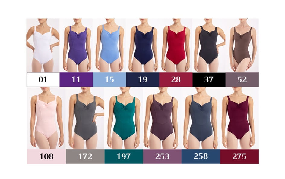 Klasyczny kostium baletowy z szerokimi ramiączkami, marszczonym dekoltem w kształcie serca i wycięciem na plecach w literę V. Elegancką sylwetkę podkreślają szwy typu Princess na piersi i w talii. Cały przód podszyty nową tkaniną bieliźnianą, bardzo przyjemna w kontakcie z ciałem.