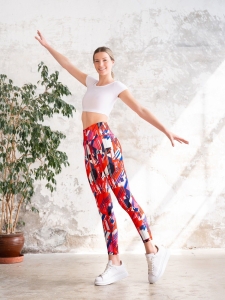 Wzorzyste legginsy z wysokim stanem. Kolor podstawowy intensywnie czerwony, pozostałe kolory to biały, odcienie niebieskiego, fioletu i różu. Idealnie dopasowujące się do sylwetki. Nie prześwitują, są wytrzymałe.