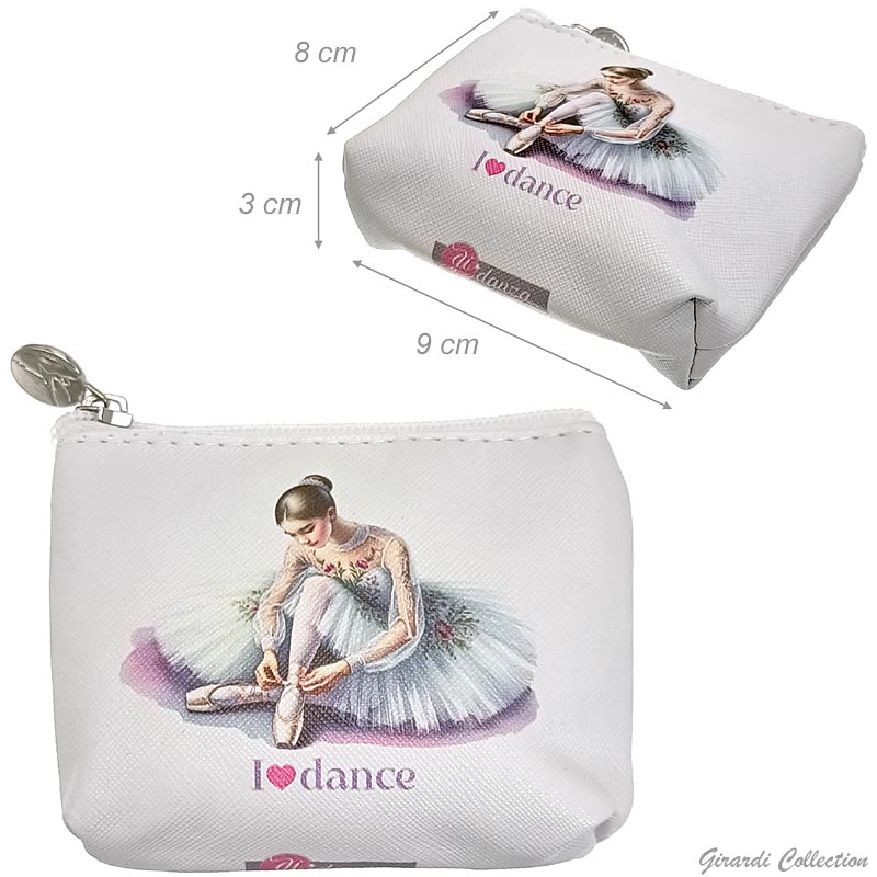 Portmonetka zasuwana na zamek błyskawiczny z nadrukiem baletnicy siedzącej na podłodze.