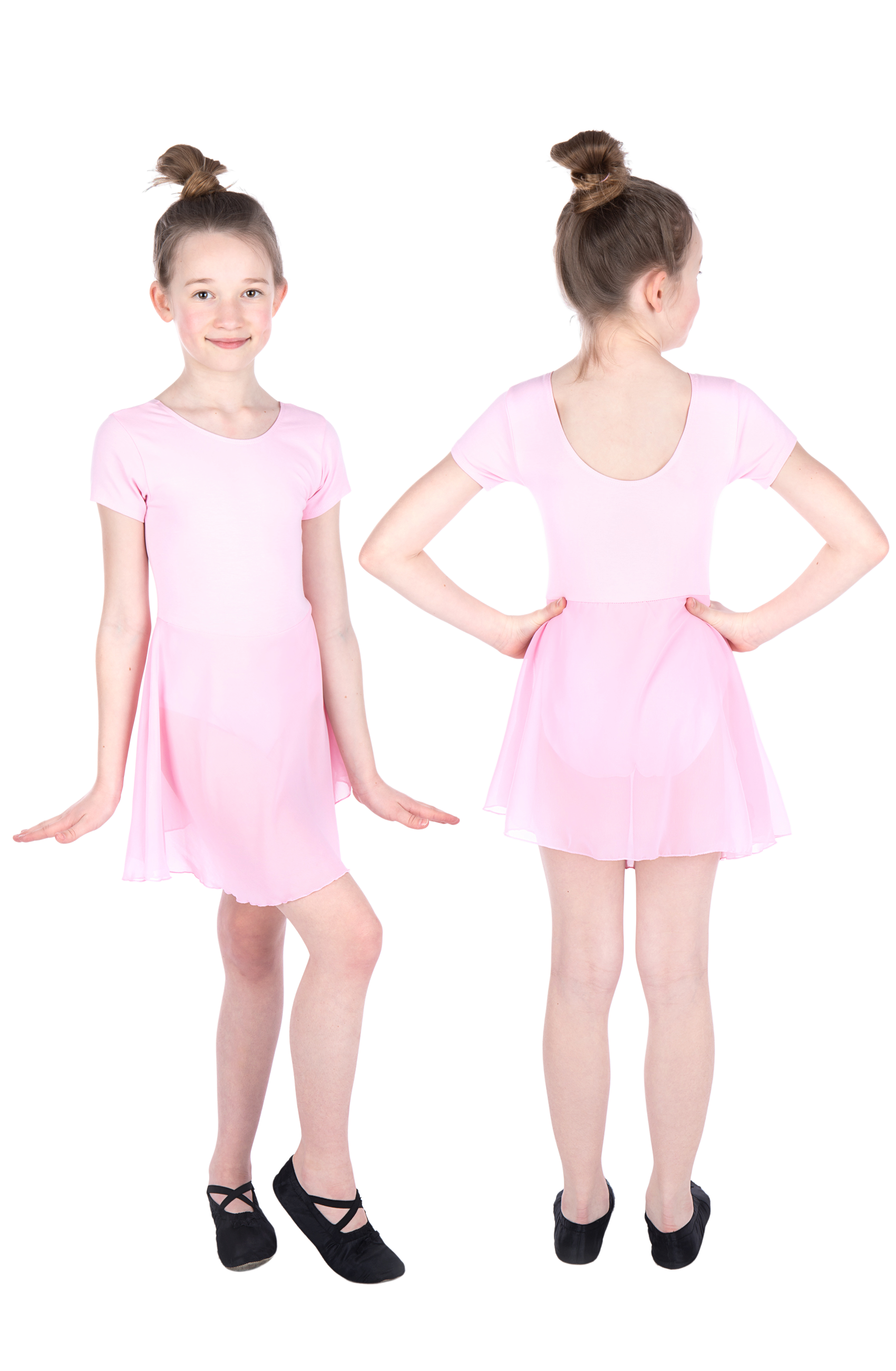 Bardzo wygodne bawełniane body baletowe z asymetryczną szyfonowa tuniczką, całość w kolorze jasnoróżowym. Idealne dla każdej dziewczynki na zajęcia baletowe i taneczne.