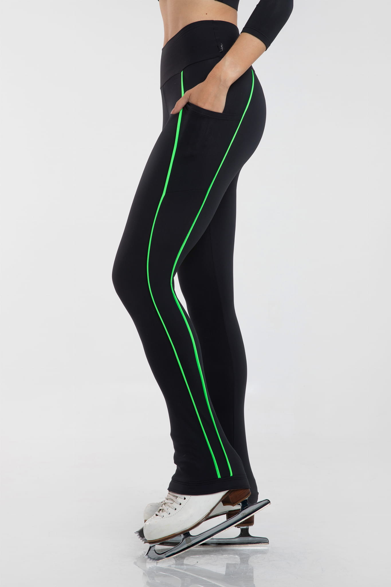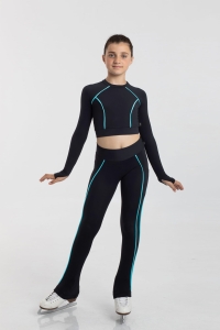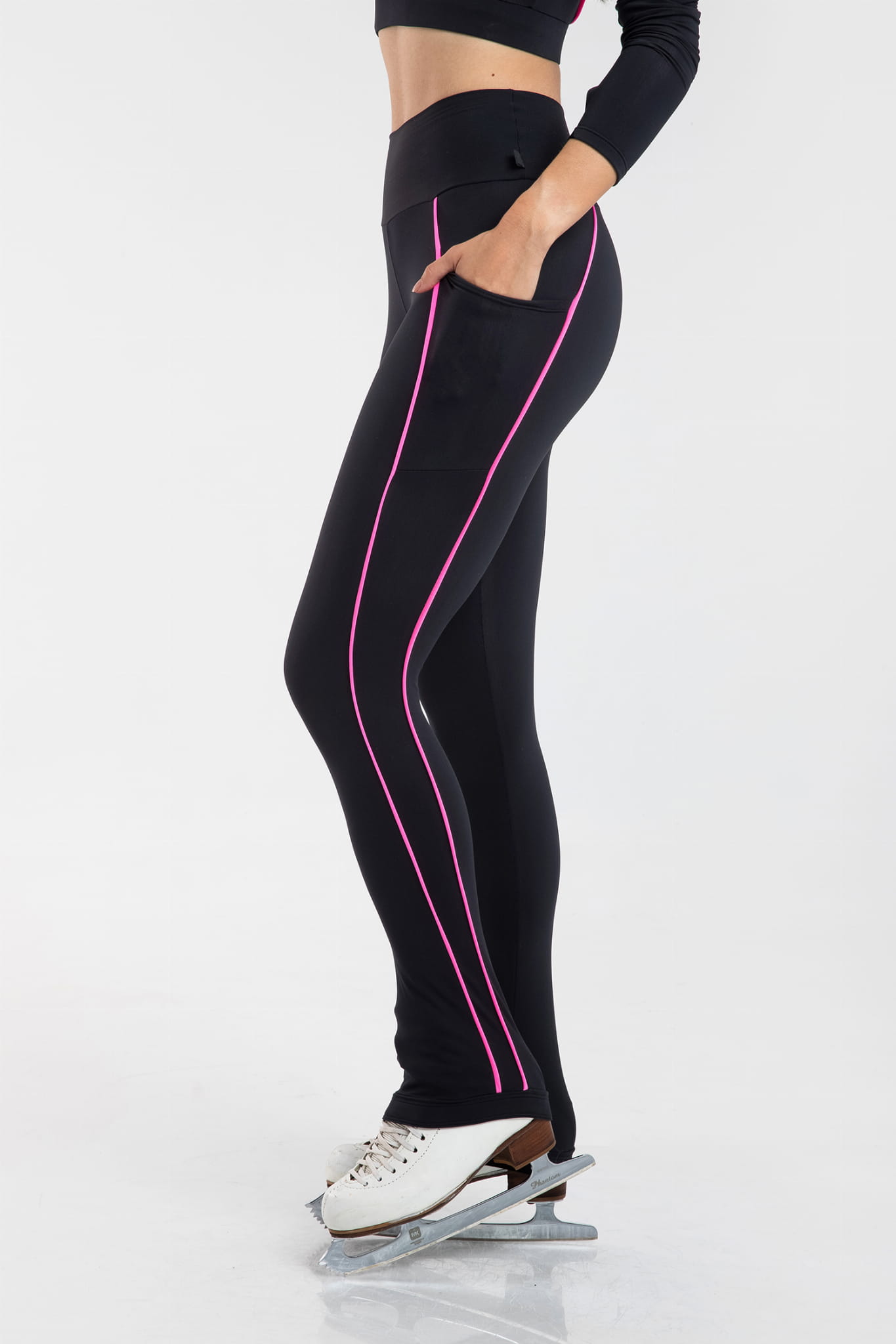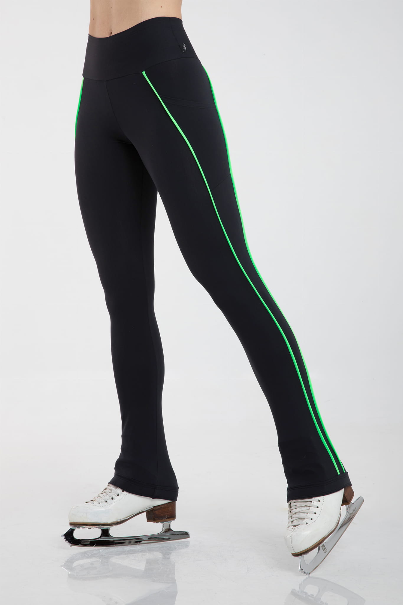 Łyżwiarskie spodnie CHAYMAE z szerokim pasem i wysokim stanem oraz boczną kieszenią. Ozdobione kolorową lamówką wzdłuż bocznych części nogawek. Wewnątrz szczotkowana tkanina (tzw. miś). dół nogawek wykończony gumą zabezpieczającą przed zsuwaniem się spodni z buta łyżwiarskiego