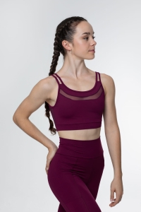 Biustonosz sportowy z podwójnymi ramiączkami i przezroczystymi siateczkowymi detalami na dekolcie. Całe plecy z siateczki z otworem. Dostępne rozmiary dla dzieci i dorosłych.